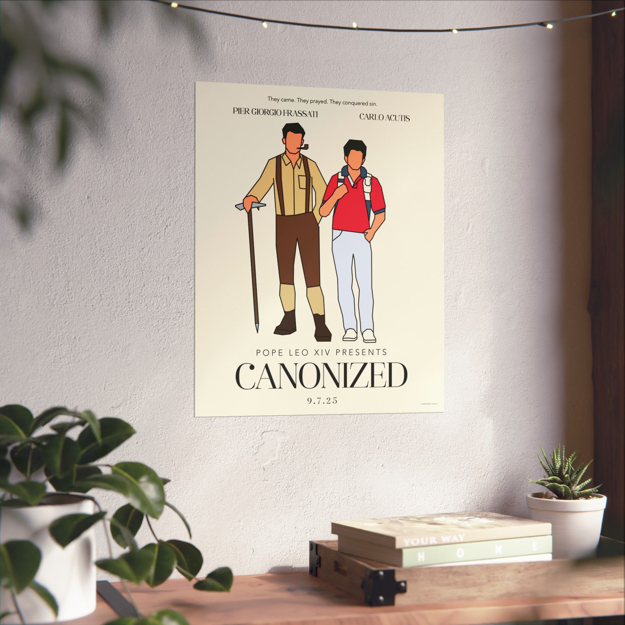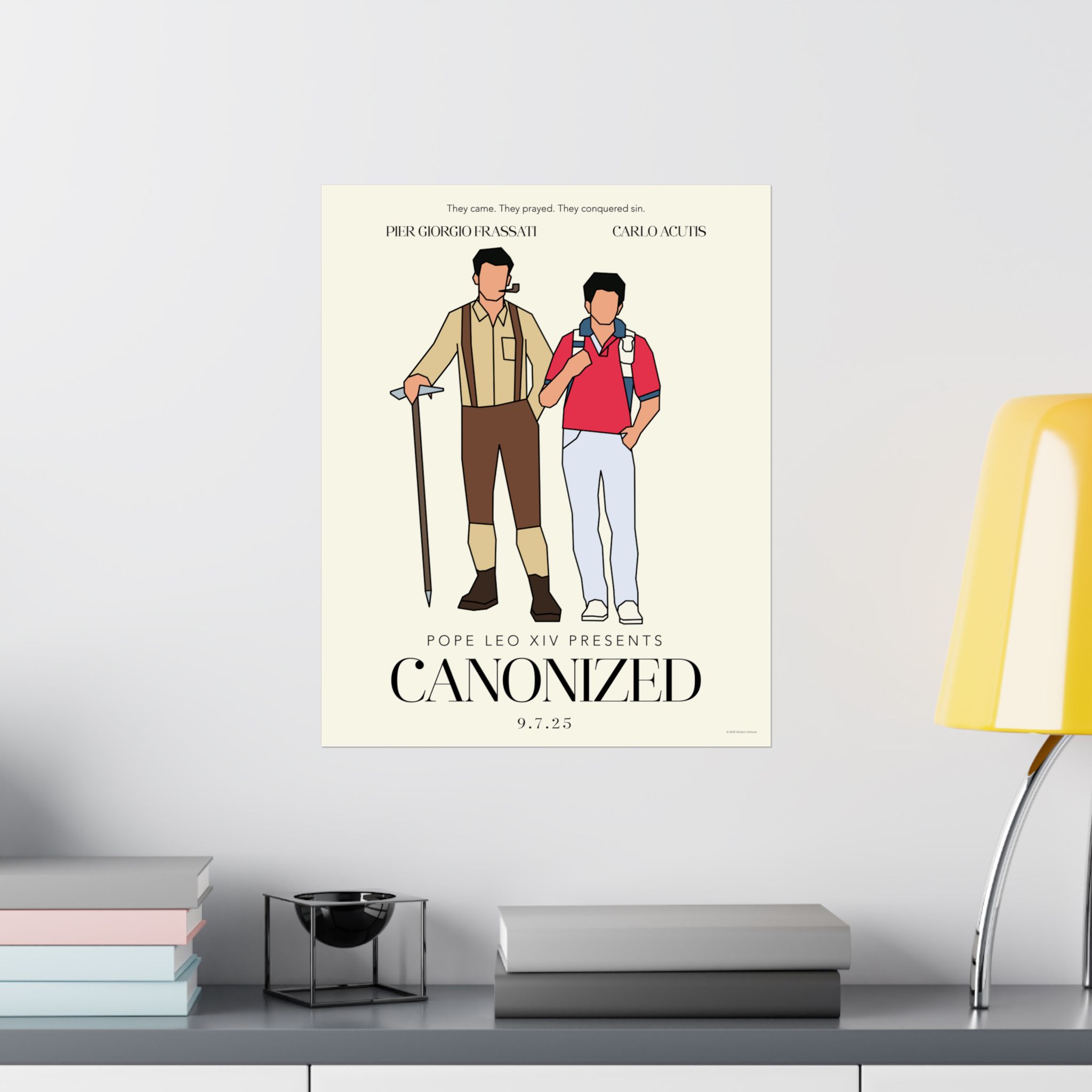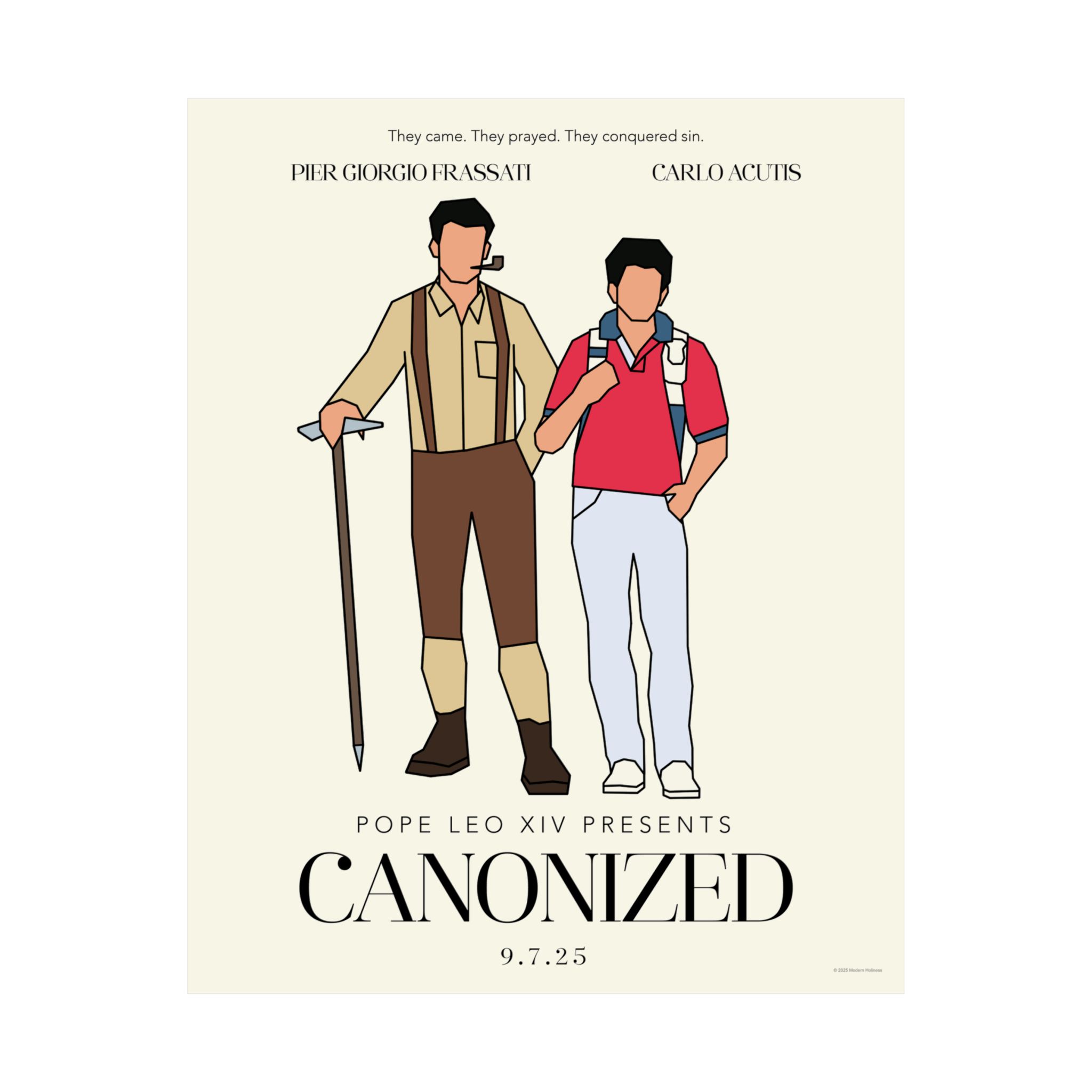 “Canonized” captures Sts. Pier Giorgio Frassati and Carlo Acutis in a limited-edition concept print that blends the drama of a movie poster with the depth of their real-life witness. It’s a wink to the truth that holiness is the real epic story, and these two lived it like legends. A bold reminder that the saints aren’t relics of the past—they’re the heroes worth imitating.