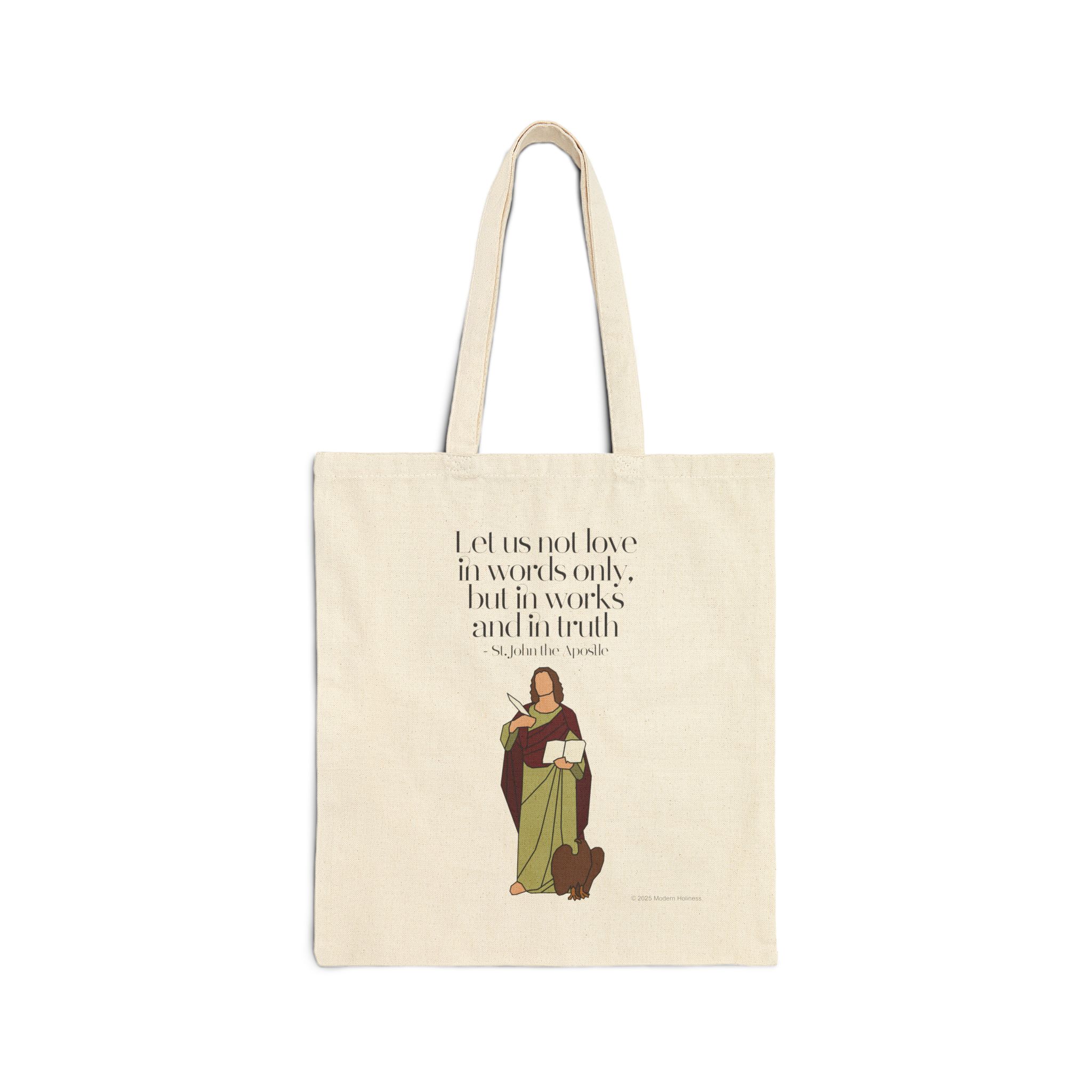 Illustrated with a feather quill and open book in his hands and an eagle at his feet, St. John embodies both the grounded work of writing the Gospel and the soaring vision of divine contemplation. Above him floats the quote “Let us not love in words only, but in works and in truth,” a challenge to let your faith show up in the everyday—less talk, more love in action. It’s not about being perfect; it’s about being real, consistent, and willing to let love take shape in the way you live.