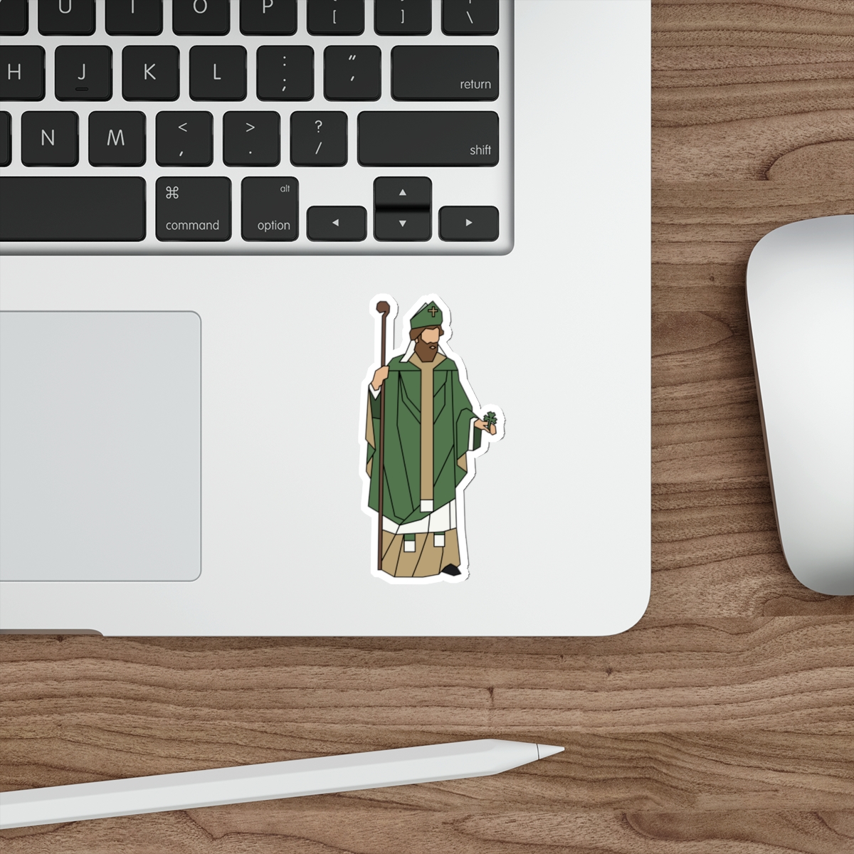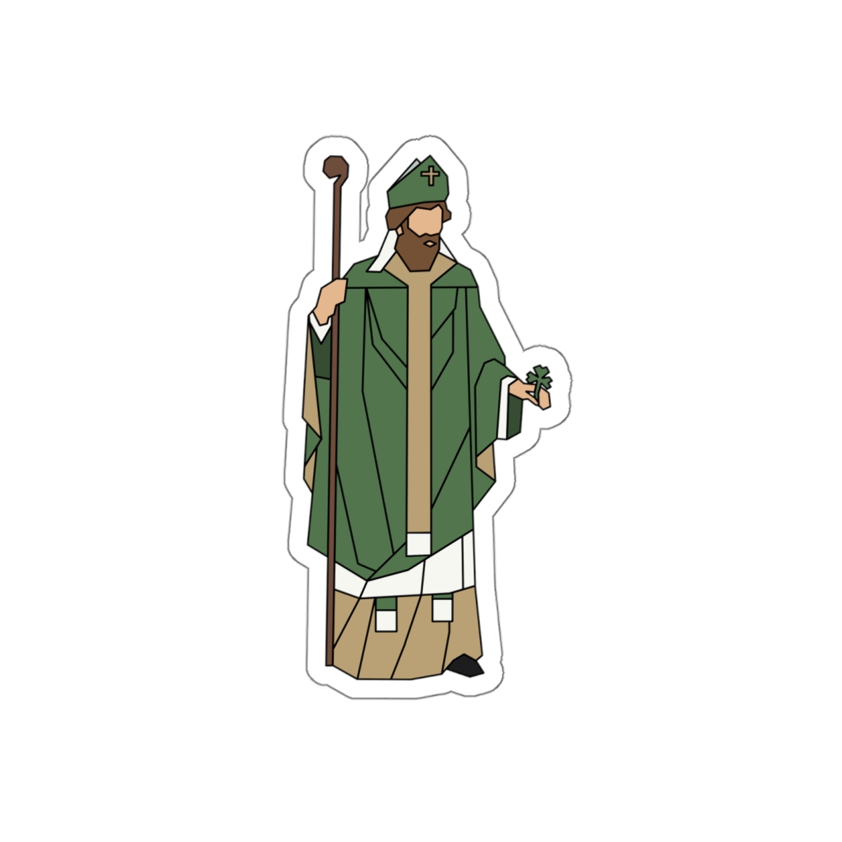 Illustrated holding a staff to signify his tireless leadership and a shamrock representing the unity of the Trinity, St. Patrick stands as a testament to the strength found in absolute surrender.