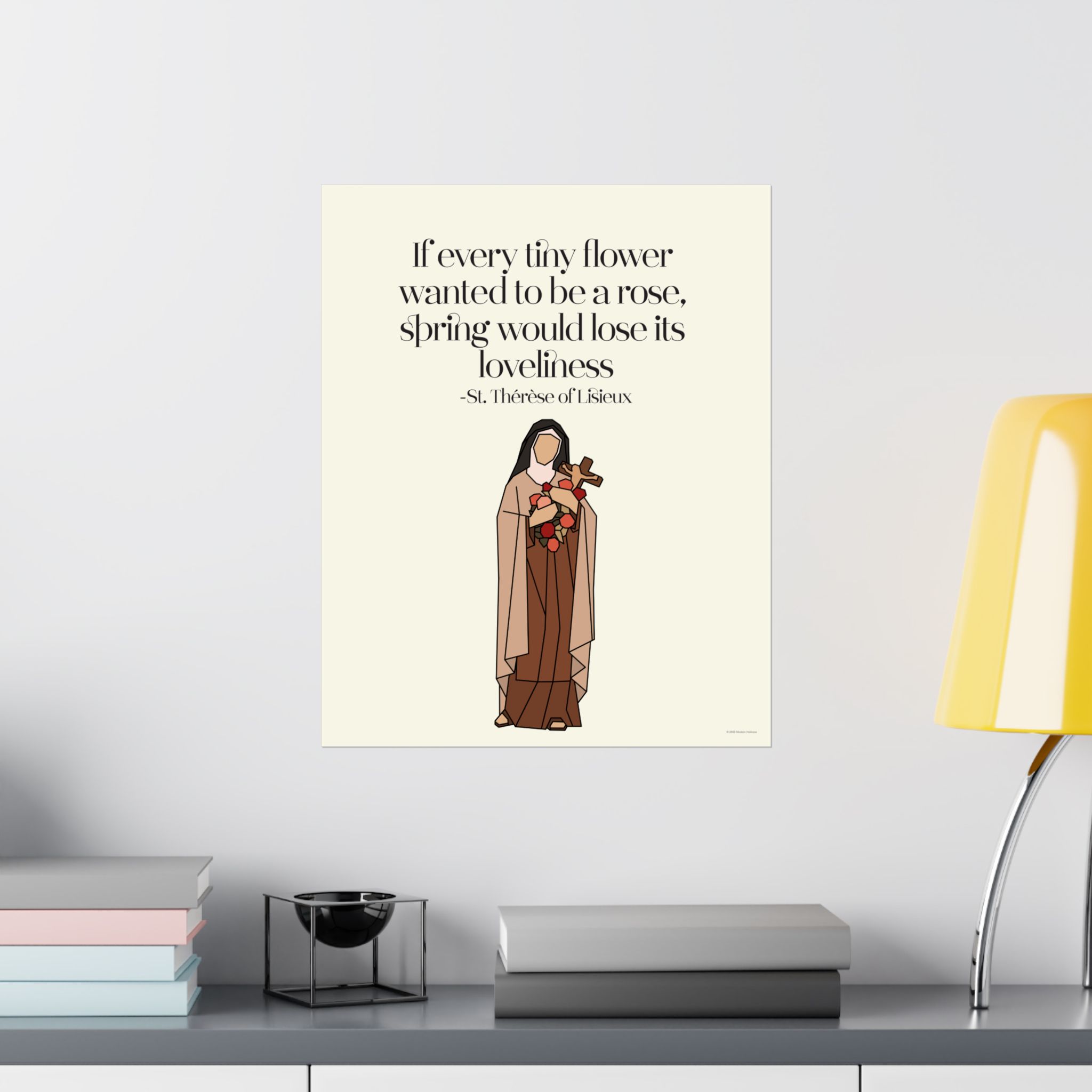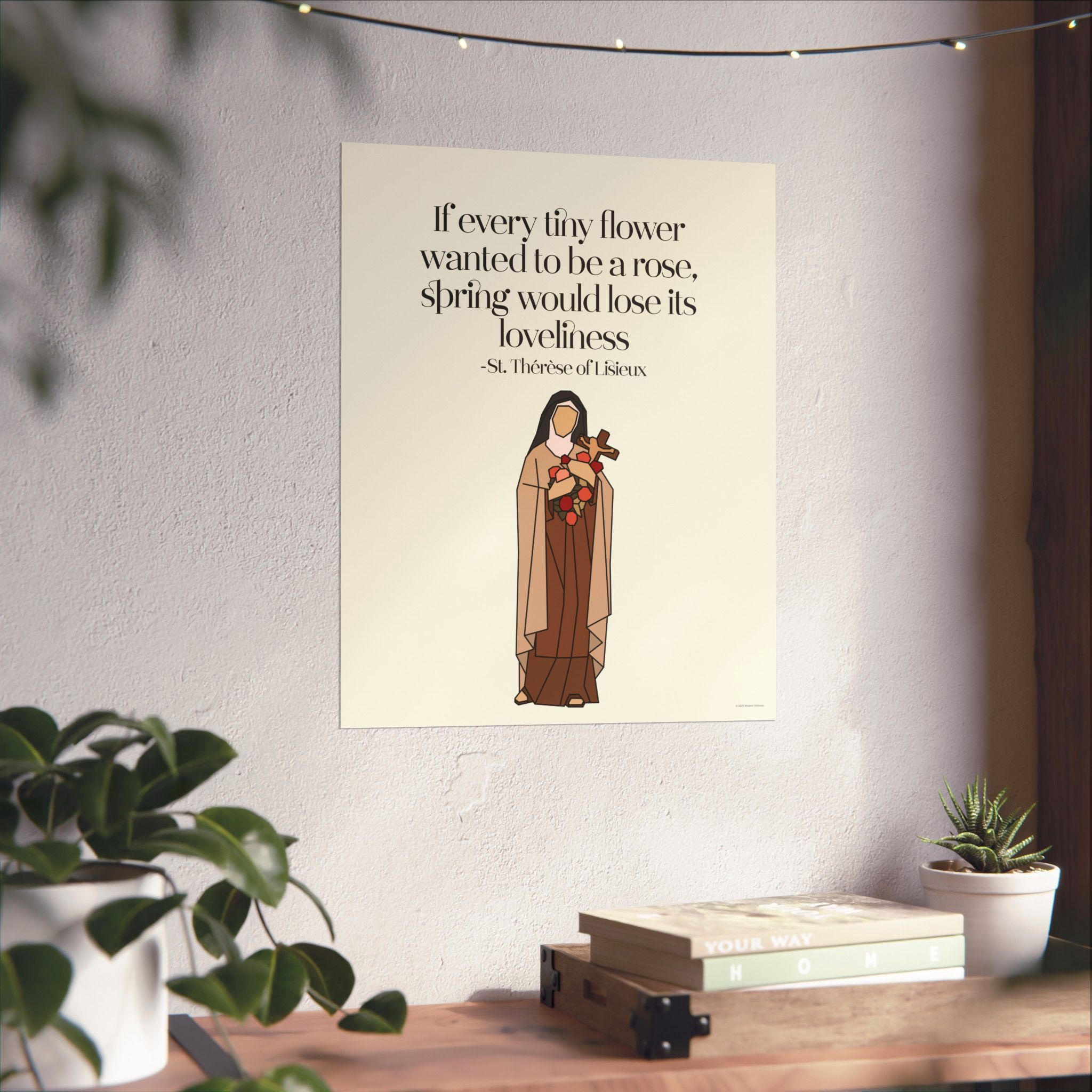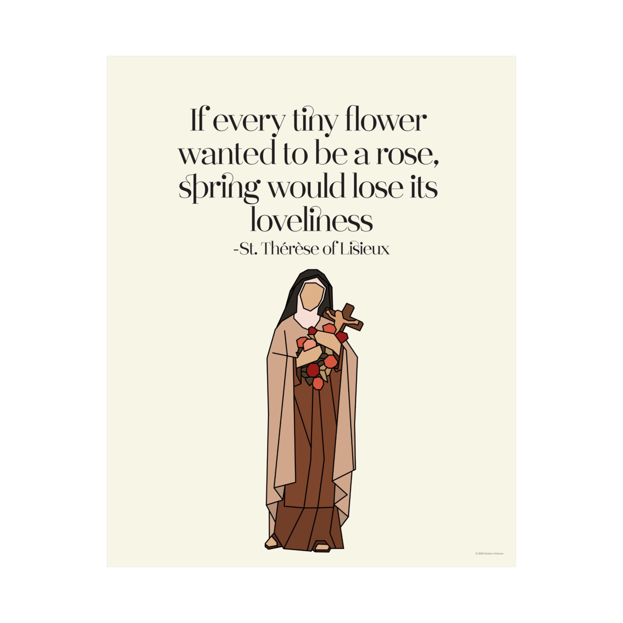 Above her floats the quote “If every tiny flower wanted to be a rose, spring would lose its loveliness,” a gentle nudge to embrace your own unique path to holiness. It’s a call to honor the quiet beauty of your vocation, however hidden or humble, and to trust that love—especially the small kind—never goes unnoticed.